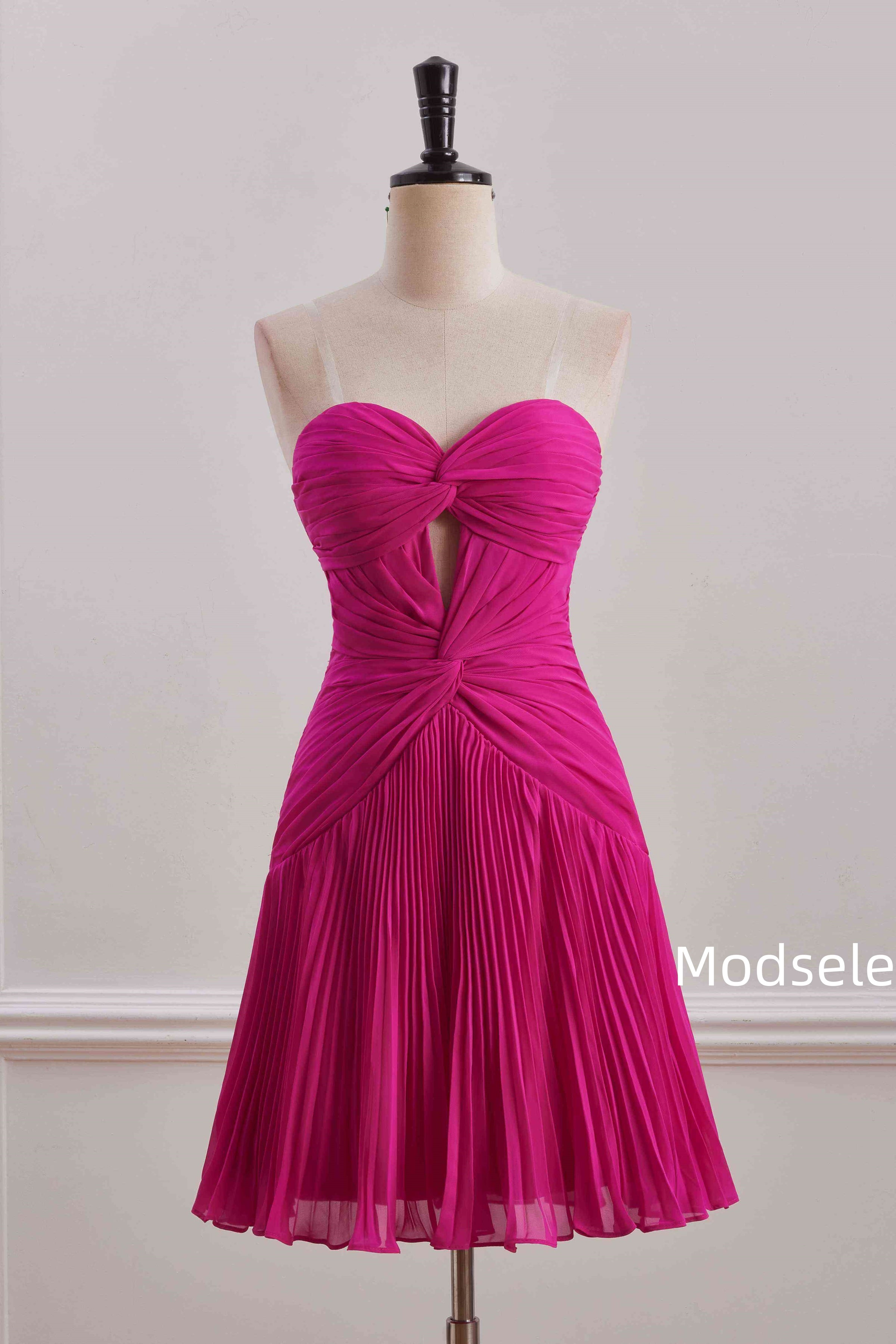 This strapless homecoming dress showcases a sweetheart neckline and an empire waist that enhances your natural shape. The A-line silhouette with delicate pleats creates a graceful and flattering look, while the short length ensures comfort and ease of movement for your celebration. Designed to help you feel confident and radiant all night.