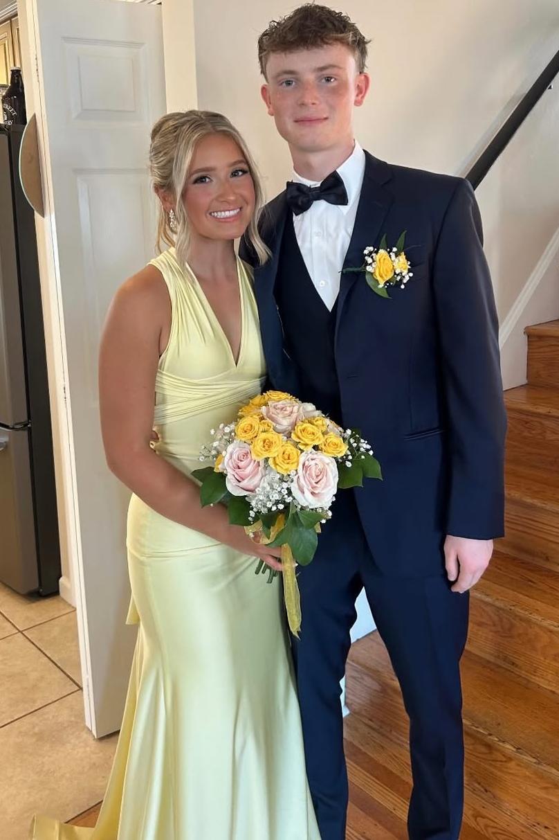Exude timeless elegance in this halter V-neck prom dress, crafted from luxurious satin with refined pleated detailing. The sleeveless halter design offers a sophisticated neckline that flatters and elongates, while the flowing silhouette skims your figure gracefully.