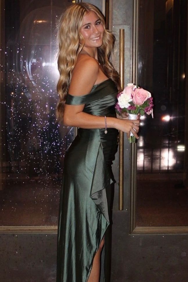 Pink Off-Shoulder Satin Pleats High Slit Long Party Prom Dress – Modsele