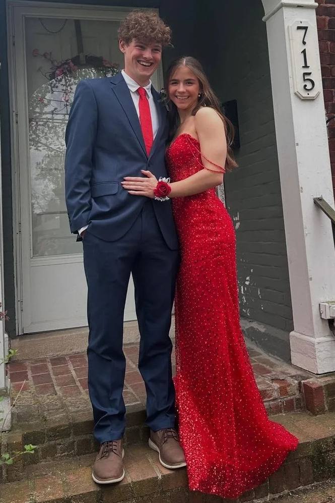 Shine brilliantly in this show-stopping mermaid prom dress that captures every light in the room. The chic off-shoulder design elegantly frames your collarbone, while dazzling sequins and glitter embellishments create an eye-catching sparkle. The sleeveless silhouette keeps you cool and comfortable, and the fitted mermaid cut hugs your figure before flowing into an impressive train.
