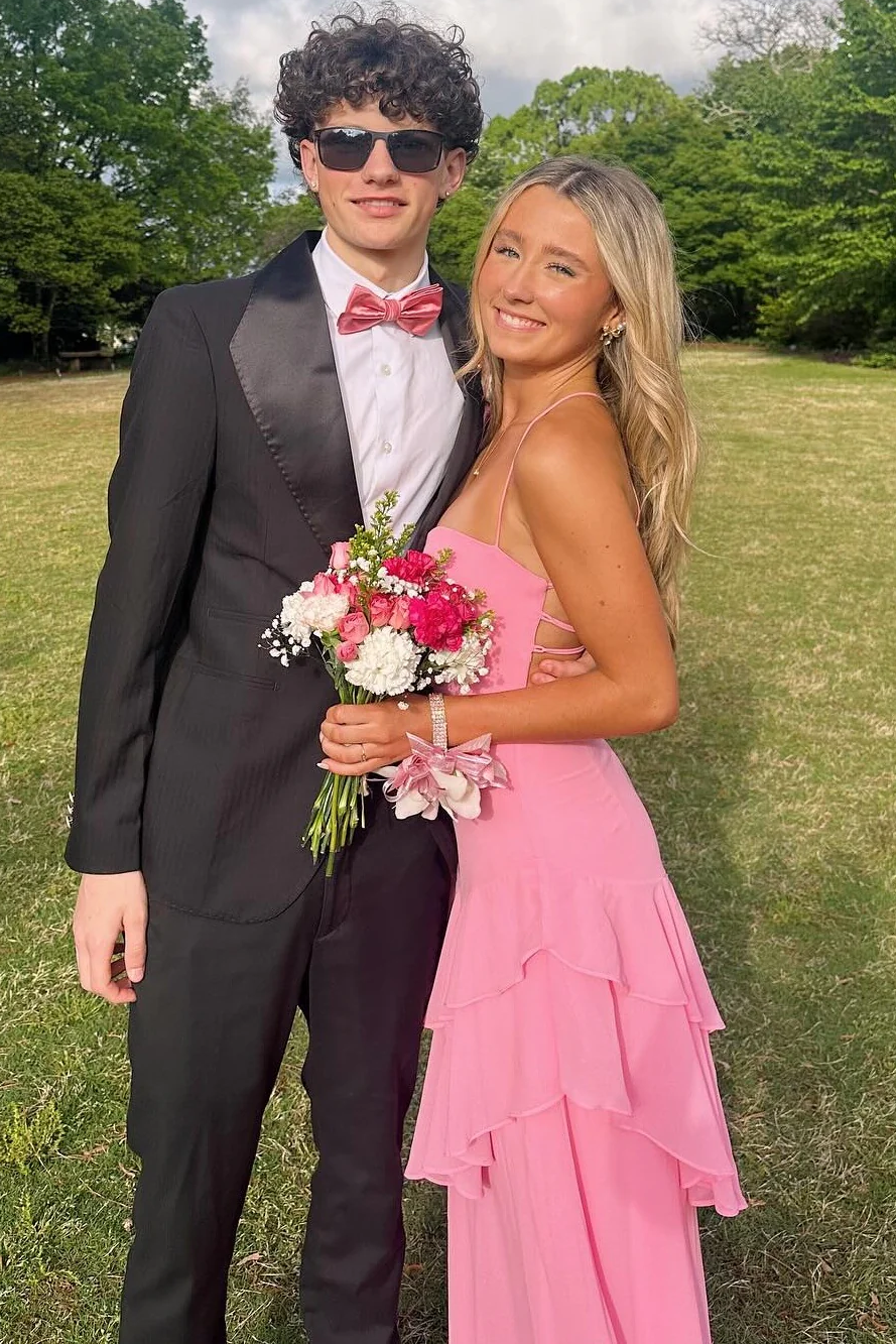 This elegant red prom dress features spaghetti straps, ruffle details, and a lace-up back. The sleeveless design adds a modern touch to this classic style. Perfect for any formal occasion, this dress will make you stand out with its beautiful lace and flattering silhouette.