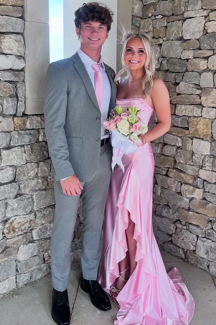 Simple Strapless Ruffles Satin High Slit Pleats Long Formal Prom Dress