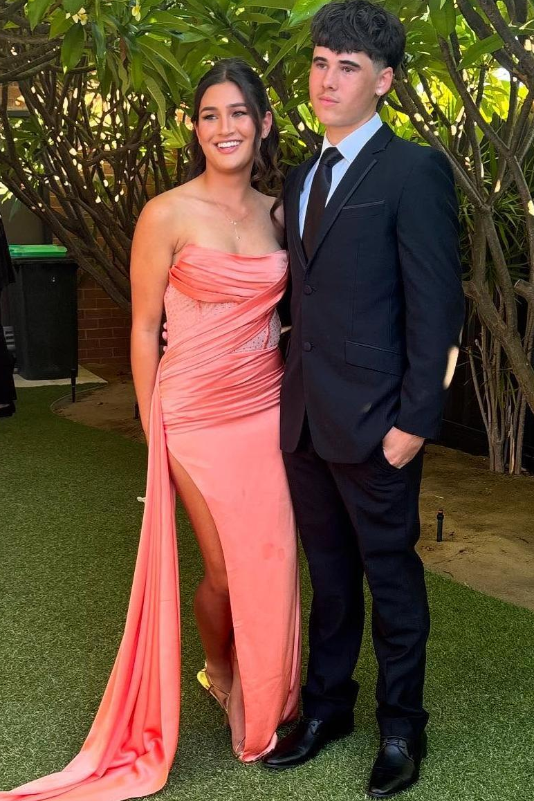 Dazzle in this glamorous prom dress that perfectly balances sophistication with show-stopping sparkle. The strapless neckline offers an elegant, timeless appeal, while a fitted bodice with refined pleating accentuates your curves beautifully.