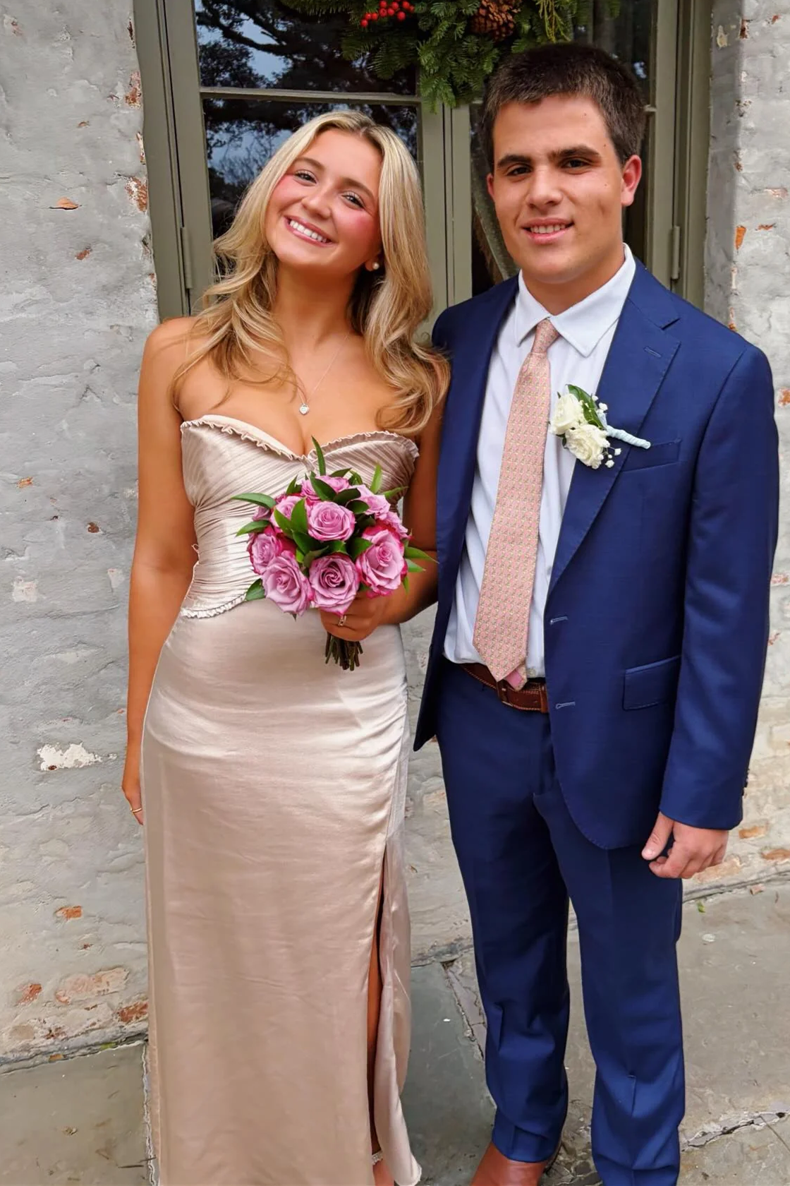 Strapless Sleeveless Ruffles Satin Pleats Side Slit Formal Prom Dress – Modsele