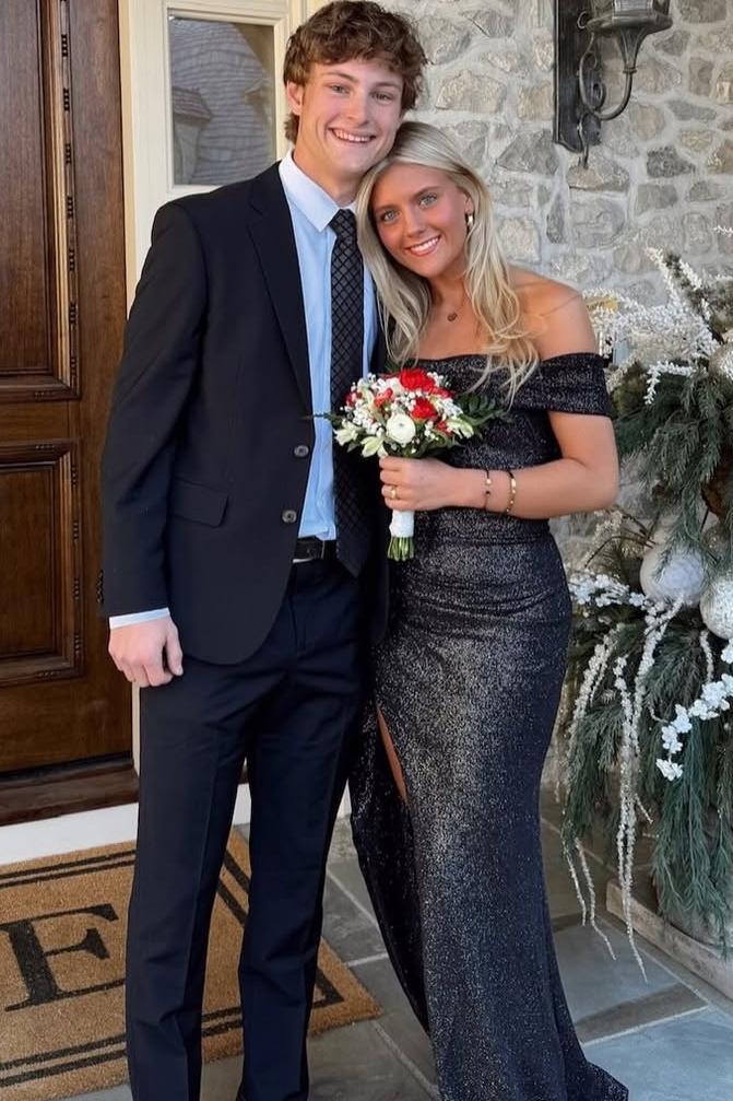 Make a sophisticated statement in this striking black prom dress. The elegant off-shoulder neckline exudes timeless glamour while delicate pleats add refined texture throughout. A high slit cuts through the flowing skirt, offering both movement and allure.